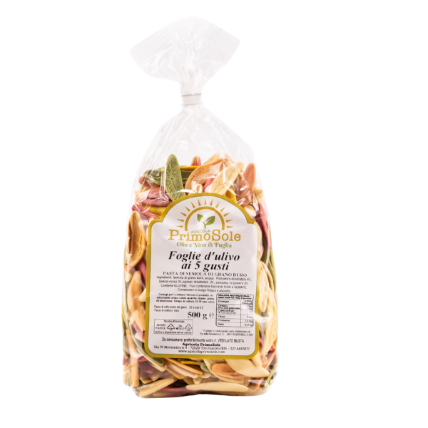Le Foglie d’Ulivo ai 5 Gusti Primosole sono una pasta artigianale pugliese realizzata con semola di grano duro di alta qualità e colorata naturalmente con spinaci, curcuma, pomodoro e barbabietola. La loro forma unica richiama le foglie d’ulivo, simbolo della tradizione mediterranea. Ideali per ricette creative e piatti ricchi di colore, mantengono un’ottima consistenza in cottura e valorizzano qualsiasi condimento. Un prodotto tipico genuino, realizzato con ingredienti semplici e naturali, perfetto per portare in tavola i sapori autentici della Puglia.