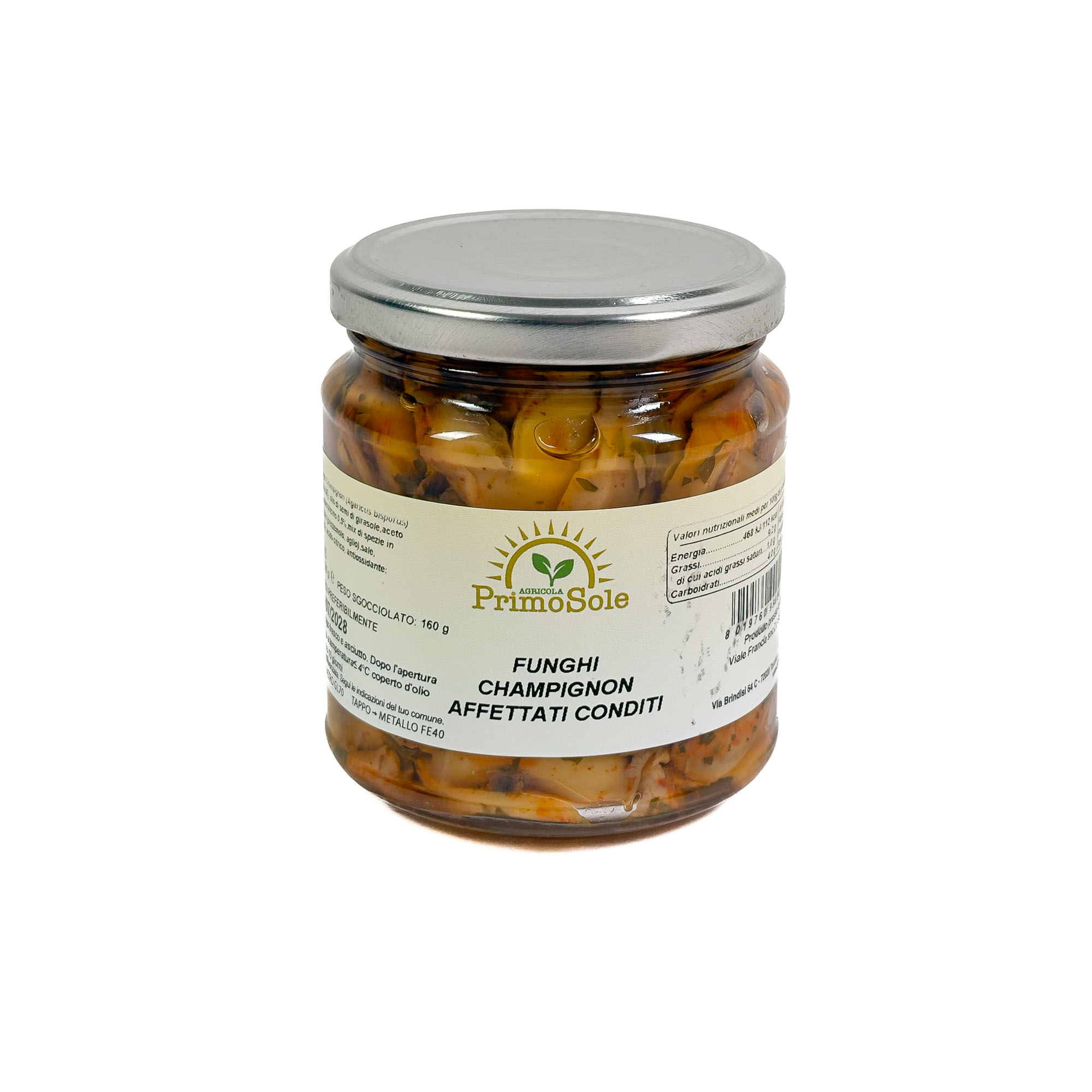 Funghi champignon affettati conditi e conservati in olio extravergine di oliva. Delicati e profumati, pronti all’uso, ideali per antipasti, contorni, pizze e ricette della cucina mediterranea.